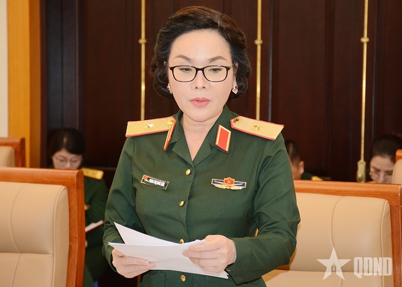 Thiếu tướng Phan Thị Hoài Vân, Phó chủ nhiệm Tổng cục Công nghiệp Quốc phòng trình bày báo cáo tại cuộc họp.