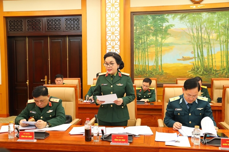 Thiếu tướng Phan Thị Hoài Vân, Phó chủ nhiệm Tổng cục Công nghiệp quốc phòng báo cáo Đề án Triển lãm Quốc phòng quốc tế Việt Nam lần thứ 3.